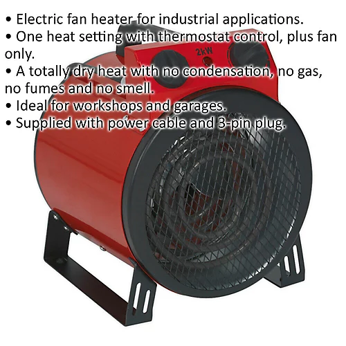 2000W Industrial Electric Fan Heater – 6800 Btu/hr – Thermostat ControlOverview: Electric fan heater for industrial applications. One heat setting with thermostat control, plus fan only. A totally dry heat with no condensation, no gas, no fumes and no smell. Ideal for workshops and garages. Supplied with power cable and 3-pin plug.Features: