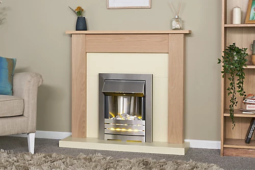 The Adam Southwold fireplace suite is an unfinished oak surround with a modern contemporary cream back panel and hearth, perfect as it is or you can paint, lacquer the unfinished oak surround to add that personal and unique touch. Combined excellently with the brilliant Adam Helios electric inset fire which provides a heat output of 1kW to 2kW and also features an LED glow effect only option.