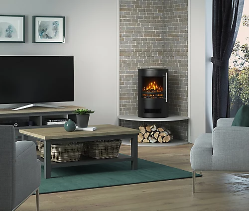 16″ Orba freestanding cylindrical electric stove in a Matt Black finish adds a charming, modern centrepiece to a room. The Orba is simple to install, simply place on a hard, level surface in a room of your choice, plug in and experience the majestic flame performance within. Ideal for secondary locations such as conservatories. Using the latest flame technology, this Eco friendly stove uses LEDs for long life and low energy consumption and includes a flame effect only setting.