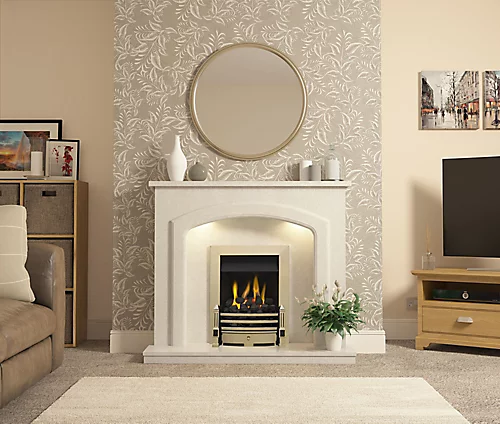 - 48″ Surround in Manila micro marble finish featuring a gentle curved arch & accentuated detail. Complete with matching hearth & back panel. Complete with under mantel lighting to enhance the look of the surround
