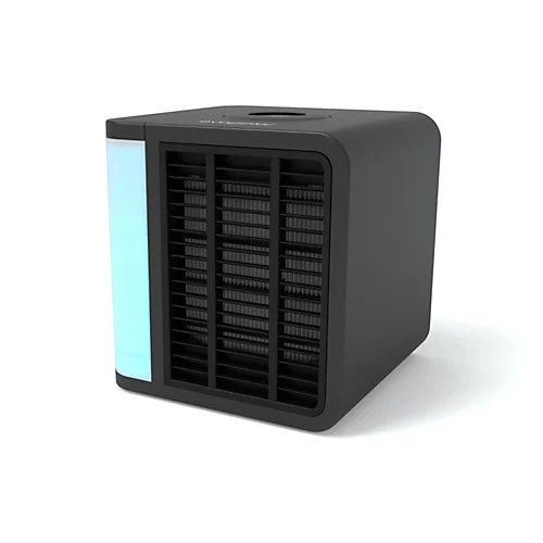 evaLIGHT plus is the best-seller evaporative air cooler with a removable water tank and enhanced leakage proof systems. You can make precise adjustments using the control wheel and adopt device lighting depending on your mood. It can be powered by a power bank, a laptop, or a power socket.