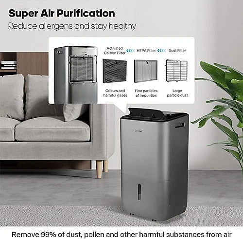 Whilst we have little control over the air outside, thanks to Lexent, the air inside our own homes and places of work can be improved and the risks reduced. As well as effective air quality con The attractive Lexent Polperro air purifier/dehumidifier employs ultraviolet (UVC) air purification technology along with a True HEPA filter to manage pathogens such as virus’s and bacteria to provide an effective solution for controlling the air quality and humidity in your home or workplace. Also able to effectively deal with streaming windows, dampness in your home, or even to efficiently aid drying laundry indoors, the multi functional Lexent Polperro represent a valuable enhancement to life, health and comfort. Quickly and easily choose between air purifier, dehumidifier or both at the touch of a button. Lexent are one of the world’s leading manufacturers of air products offering innovation, build quality and unrivalled styling. With intuitive features such as touch screen & Wi-Fi control, an on-off timer, child lock function coupled with an impressive 30 litre water extraction capacity, the Lexent Polperro really delivers. Safety:- CE & UKCA safety compliance Compressor with built-in overload protector Water full protection with liquid level magnetic switch Corrosion resistant internal pipework Fire-resistant cover for the compressor Dust-proof and damp-proof protective box for display panel Designed, Engineered and Supported in the UK.