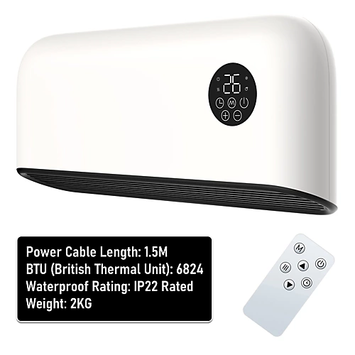 FEATURE PACKED & SAFE: Waterproof rated IP22, remote control, PTC heating Element, intelligent thermostat, 7-day programmable timer, countdown timer and basic function, cool air setting, Open Window Detection, Clear LCD Display, Temp setting 10 – 35°C, AC230V, 50-60Hz, safety thermal cut-out, overheat protection