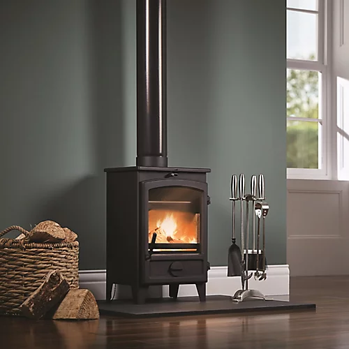 The Suncrest Go Eco Highline 5kW stove stands tall and proud with a glass viewing window.