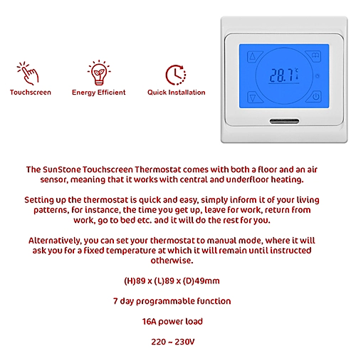 SunStone’s renowned PVC heating mat system is ideal for installations within regularly shaped areas, where the mats can be quickly rolled out across the floor in parallel runs. The heating cable is attached through a series of loops to a thin but tough fibreglass mesh for rapid installation. Complete with White Touch Thermostat.
